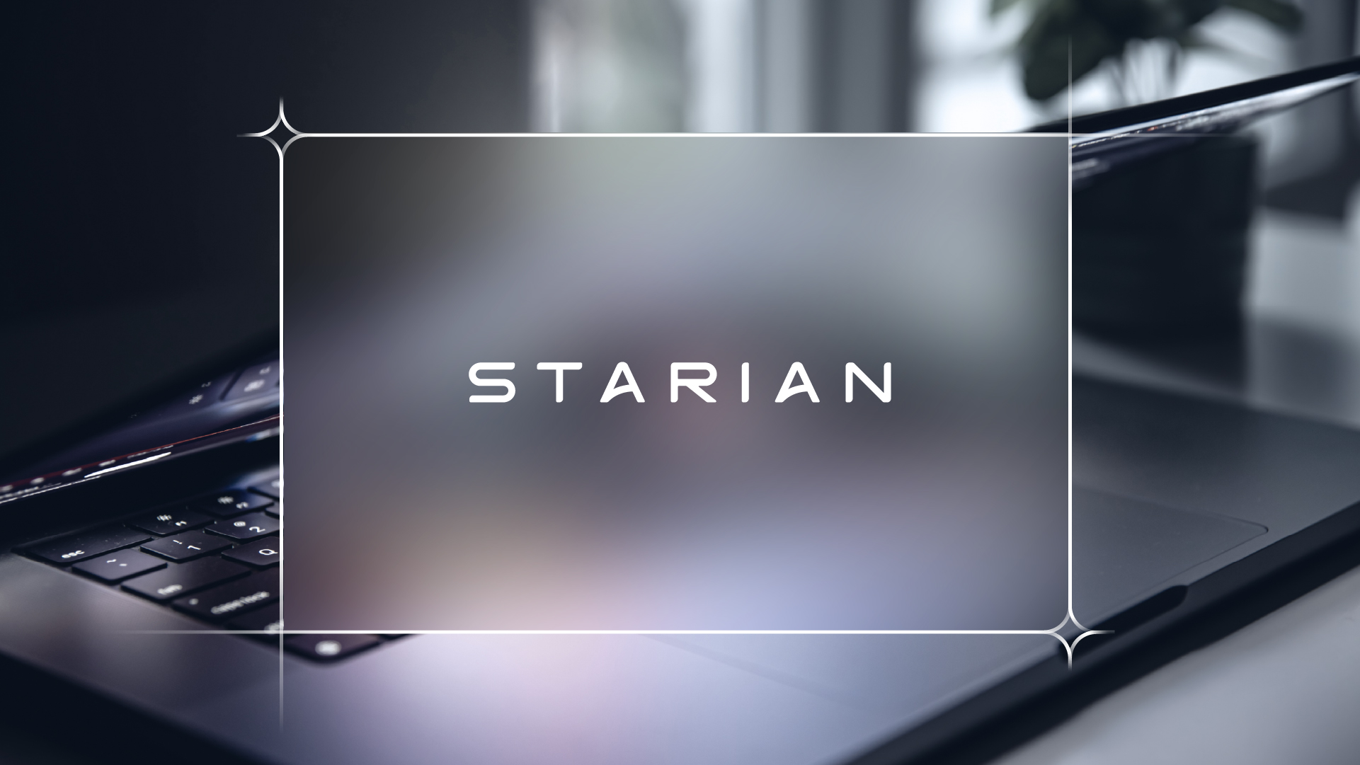 A marca gráfica da Starian possui uma estrela de quatro pontas que pode ser aplicada como redução para favicon e profile picture quando necessário. Seu formato, além de se conectar à tecnologia de inteligência artificial, combina a sua pluralidade de verticais ao se formar a partir dos cantos arredondados de seus produtos.